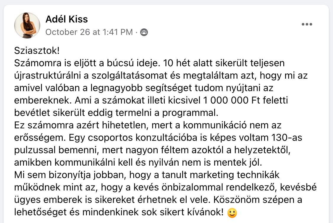 Névvel, arccal, képernyőfotókkal fogom neked igazolni, hogy aki a megfelelő ügyfélszerző folyamatot használja, milyen látványos eredményeket tud elérni, mennyire rövid idő alatt.